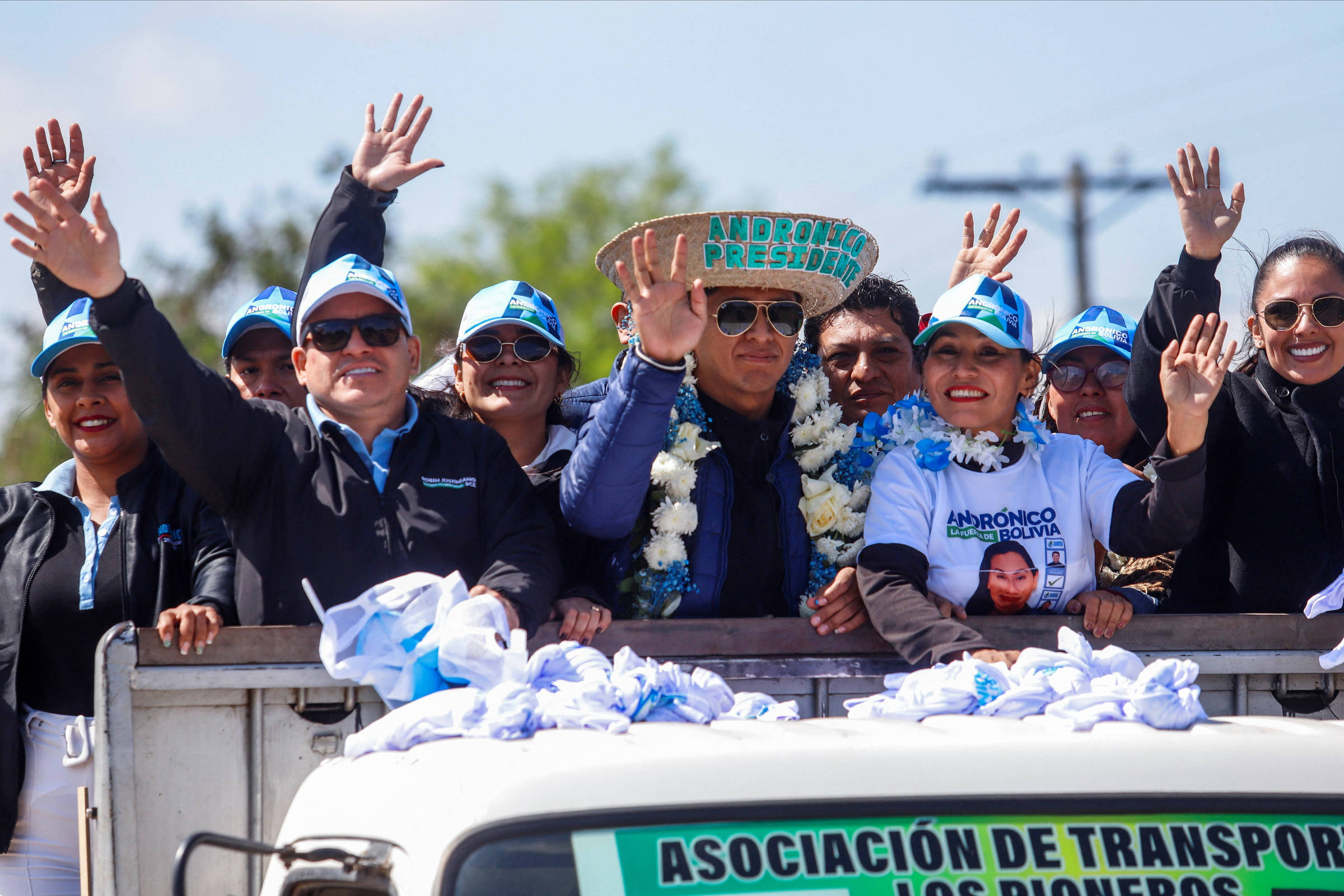 A imagem mostra um grupo de pessoas em um caminhão, acenando e sorrindo. Algumas pessoas usam camisetas e bonés azuis, enquanto outras estão vestidas com roupas escuras. Um homem no centro usa um chapéu grande e está cercado por flores. Ao fundo, há uma paisagem com árvores e postes de eletricidade. Na frente do caminhão, há uma faixa com o texto